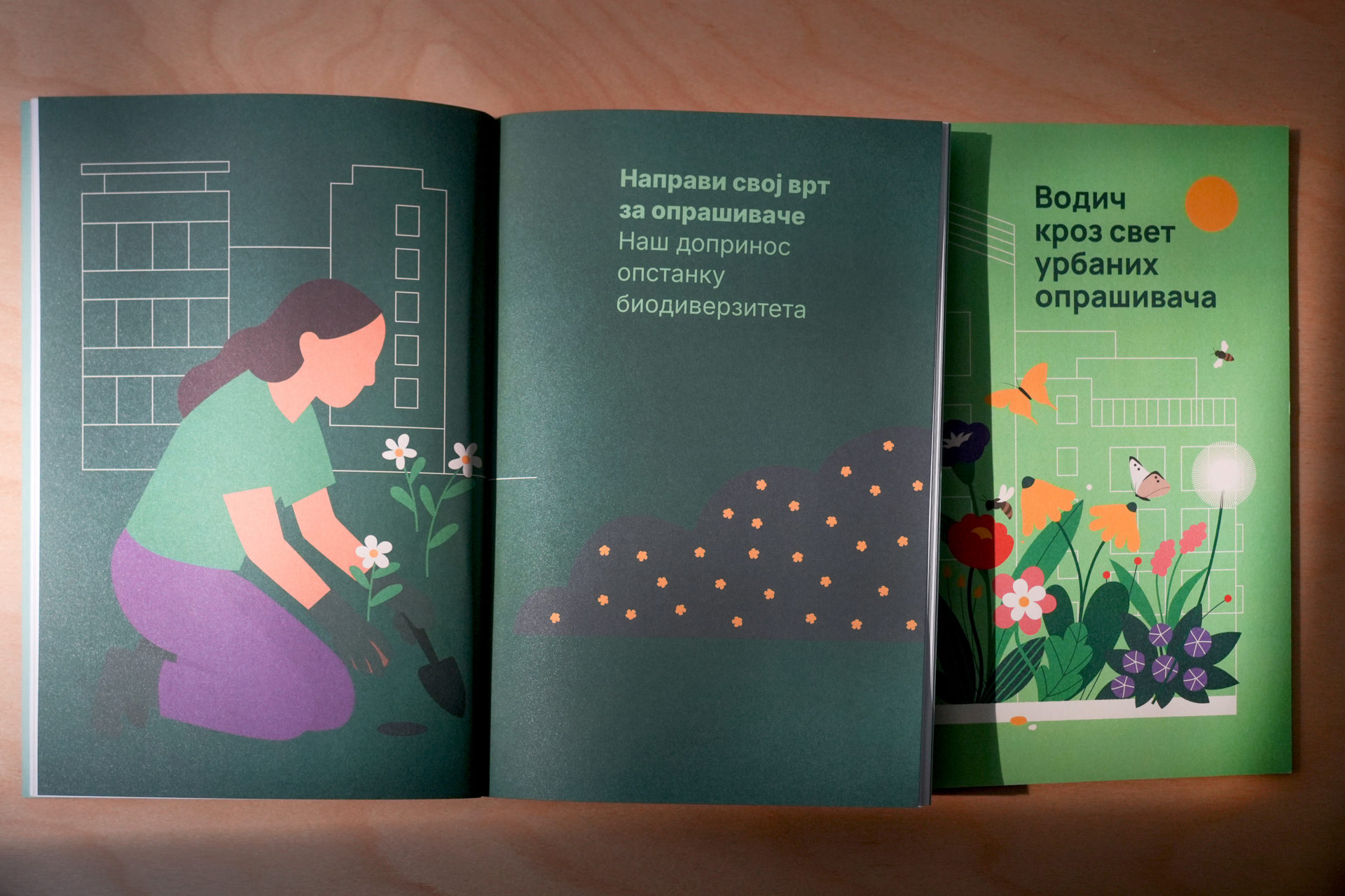 The second brochure, “A Guide to Honey Bees, with a Small Contribution to Biodiversity: How to Create a Garden for Pollinators”, focuses on honey bees, urban beekeeping and practical steps for creating pollinator-friendly gardens. It explains who honey bees are, how a hive functions and what bee products (honey, wax, propolis, royal jelly, pollen and bee bread) mean for both the hive and the wider ecosystem. The publication then turns into a hands-on guide: how to assess your space, choose suitable plants, plan a garden that offers nectar and pollen through the seasons, reduce pesticides and provide water and shelter. Throughout the text, climate change and climate justice are presented as key reasons to support pollinators and protect biodiversity.